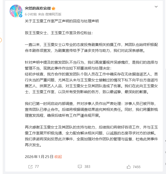 1月25日凌晨,王玉雯工作室全平台发声明,全面停止《突然的喜欢》的一切宣传工作。声明称,剧方合作的宣发团队无端恶意造谣演员闻喜策略,挑拨王玉雯方和平台的关系。